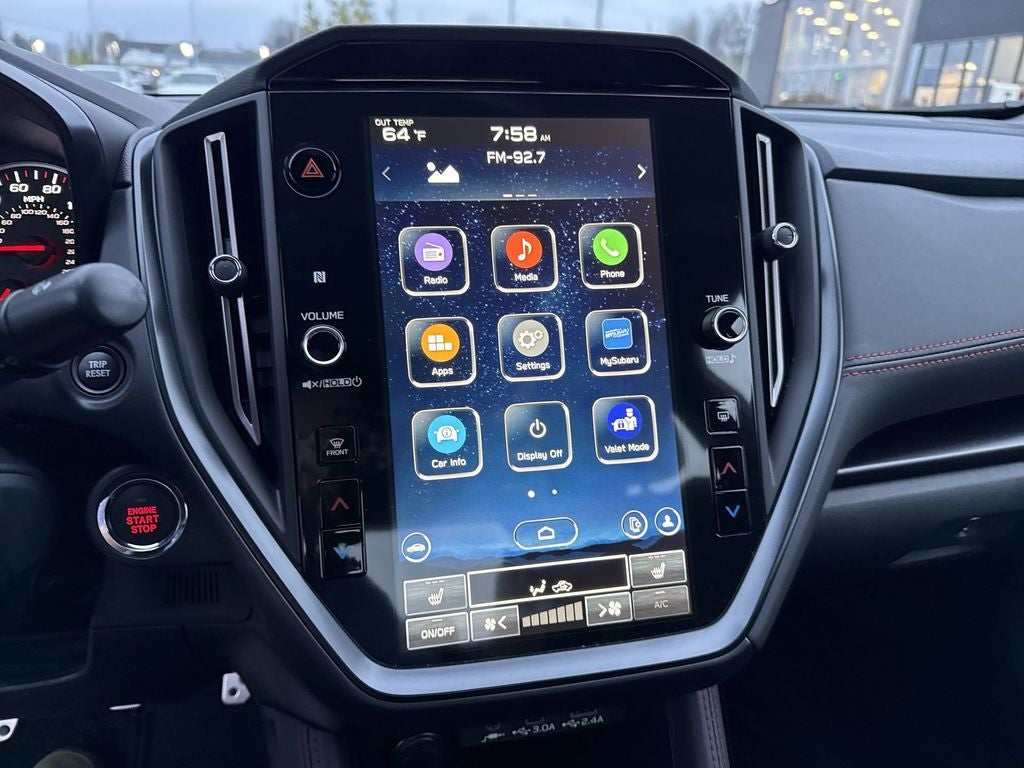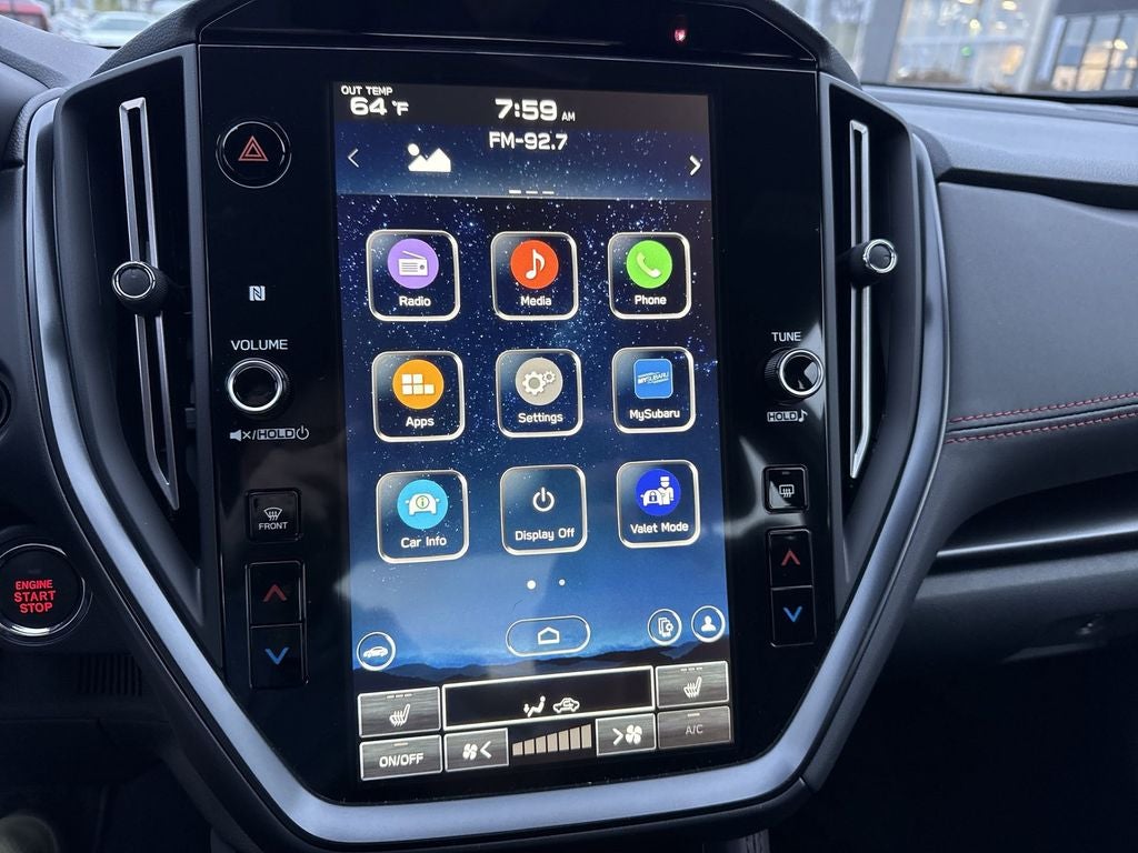 - Radio: Subaru 11.6" Multimedia Plus System -inc: AM/FM stereo HD radio, valet mode, multi-touch gesture high resolution display screen, voice activated controls, Bluetooth® audio streaming and hands-free phone connectivity, Bluetooth® hands-free SMS text messaging connectivity, iPod control capability, rear-vision camera display, smartphone integration: Android Auto w/full screen view and wireless connection, Apple CarPlay w/full screen view and wireless connection, USB and Over The Air (OTA) audio system update, 6 speakers and roof mounted audio, satellite and connected services antenna, SiriusXM w/360L (4 months free trial included/subscription required after) and SiriusXM Travel Link (4 months free trial/subscription required after)