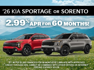 Get as low as 2.99% APR for 60 months on the purchase of a new 2026 Kia Sportage or Sorento for well-qualified buyers. See dealer for more details.